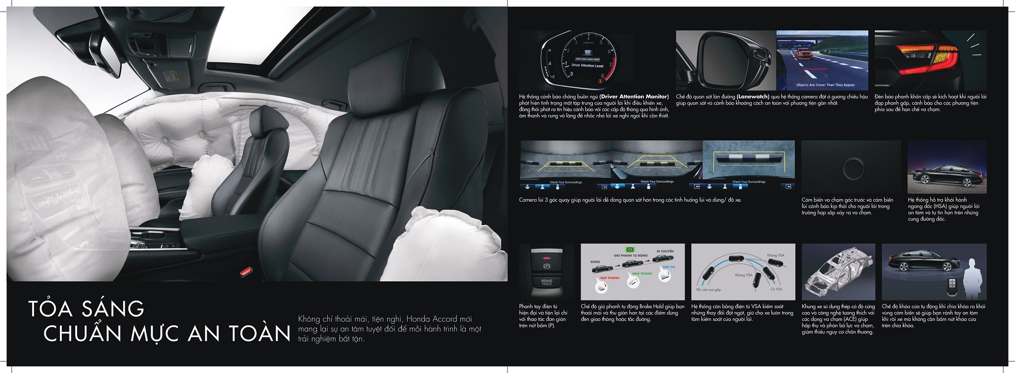 Bên cạnh đó, Honda Accord mới được trang bị các công nghệ an toàn tiên tiến như Hệ thống cảnh báo chống buồn ngủ (Driver Attention Monitor), Hệ thống quan sát làn đường (Honda Lanewatch), Phanh tay điện tử (EPB), Giữ phanh tự động, Cân bằng điện tử (VSA), Hỗ trợ khởi hành ngang dốc (HSA), Camera chiếu hậu đa góc, hệ thống an toàn 6 túi khí,…nhằm hỗ trợ người lái suốt hành trình di chuyển và bảo vệ toàn diện cho tất cả hành khách. Không chỉ thoải mái, tiện nghi, Honda Accord 2022 mới mang lại sự an tâm tuyệt đối bởi hệ thống an toàn được trang bị tiên tiến nhất để mỗi hành trình là một trải nghiệm bất tận.
