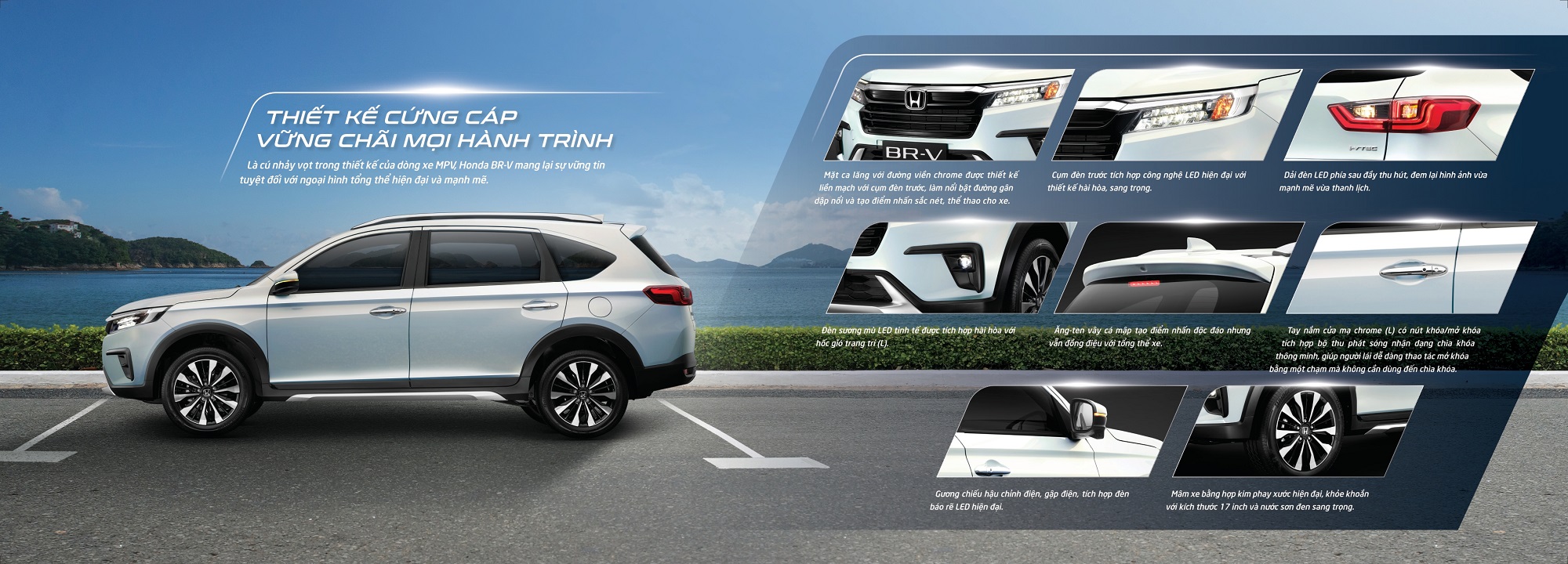 Thiết kế là điểm nổi bật ở Honda BR-V với những ưu điểm về ngoại thất theo phong cách SUV. Honda BR-V hoàn toàn mới có kích thước dài, rộng, cao lần lượt là 4.490 mm x 1.780 mm x 1.685 mm. Kích thước này vừa giúp tối ưu không gian sử dụng cũng như làm tôn lên kiểu dáng đậm chất thể thao vốn có của dòng xe Honda. Ngoại thất BR-V thu hút người nhìn bởi: dải đèn LED phía trước cùng với lưới tản nhiệt dạng thanh ngang thể hiện sự mạnh mẽ và cao cấp ở phía đầu xe, đường gân dập nổi khỏe khoắn chạy dọc thân xe và đèn hậu LED phía sau đem lại hình ảnh lịch lãm nhưng không kém phần năng động. Khoảng sáng gầm thông thoáng cùng mâm xe bằng hợp kim phay xước hiện đại, khỏe khoắn với kích thước 17 inch, nước sơn đen sang trọng càng giúp tôn lên vẻ ngoài thể thao của BR-V.