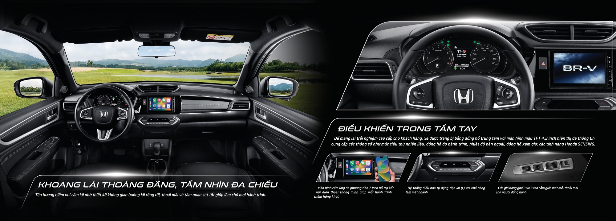 Bên trong xe cũng được trang bị những chi tiết đầy tinh tế như: gương trang điểm, ổ sạc điện ở tất cả các hàng ghế (bản L) và các ngăn chứa đồ tiện dụng. Bảng điều khiển trung tâm được trang bị màn hình màu TFT không chỉ hiển thị các chỉ số thông thường mà còn hiển thị các tính năng của Honda SENSING để hỗ trợ tốt nhất cho người điều khiển. Phần nội thất của Honda BR-V được thiết kế chú trọng đến không khí ôn hòa trong toàn bộ cabin. Hệ thống điều hòa làm mát nhanh được phát triển để đáp ứng điều kiện khí hậu của các quốc gia châu Á. Ngoài ra, hệ thống cửa gió điều hòa trang bị cho cả hai hàng ghế phía sau cũng đem đến sự thoải mái cho mọi hành khách trong suốt hành trình. Sự kết hợp của các tính năng này đảm bảo duy trì nhiệt độ bên trong phù hợp với mọi điều kiện thời tiết và luôn mang lại bầu không khí dễ chịu nhất cho tất cả hành khách trên xe. Không chỉ vậy, để thỏa mãn nhu cầu giải trí của khách hàng cùng gia đình, Honda BR-V cũng được trang bị màn hình giải trí hiện đại có thể kết nối điện thoại thông minh, Bluetooth, USB. Với hệ thống 6 loa, người lái hay hành khách, dù ngồi ở vị trí nào trên xe cũng cảm nhận được không gian âm nhạc hài hòa và chân thực. Hơn thế nữa, Honda BR-V còn được áp dụng công nghệ tiên tiến để đưa đến sự tiện nghi hơn cả mong đợi cho các khách hàng của mình. Lẫy chuyển số linh hoạt (bản L), tính năng khởi động xe từ xa (bản L), mở khóa xe thông minh chỉ bằng một lần chạm và xe tự động khóa cửa khi chìa khóa ra khỏi vùng cảm biến sẽ giúp người lái xe an tâm và thoải mái trên mọi cung đường.