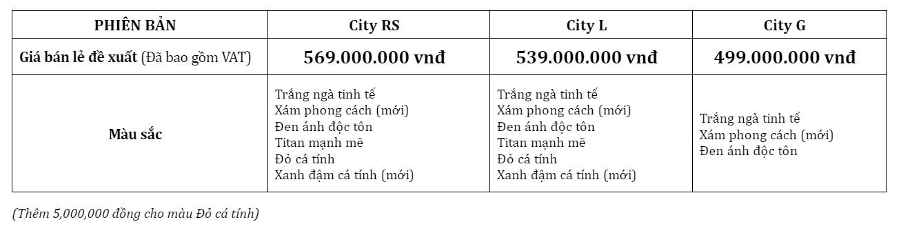 Nối tiếp thành công đó, ngày 4 tháng 7 năm 2023, Honda City bản nâng cấp mới chính thức được ra mắt thị trường Việt Nam với thông điệp “Kiêu hãnh vươn xa”, hứa hẹn sẽ đem lại một trải nghiệm nâng tầm trên mẫu xe này nhờ duy trì những giá trị cốt lõi nổi bật của ô tô Honda: “Thiết kế thể thao – Vận hành mạnh mẽ - Công nghệ tiên tiến – Thân thiện với môi trường – An toàn vượt trội”. Honda City mới gồm 03 phiên bản (RS, L, G) cùng 6 màu ngoại thất được lắp ráp, phân phối chính hãng tại Việt Nam với mức giá bán lẻ đề xuất như sau: