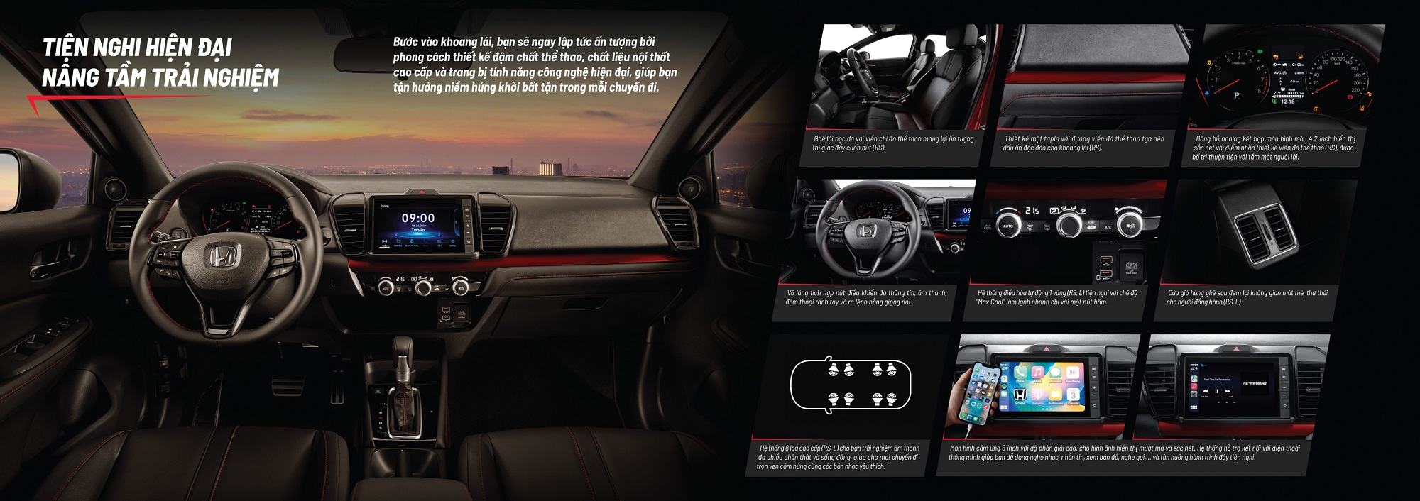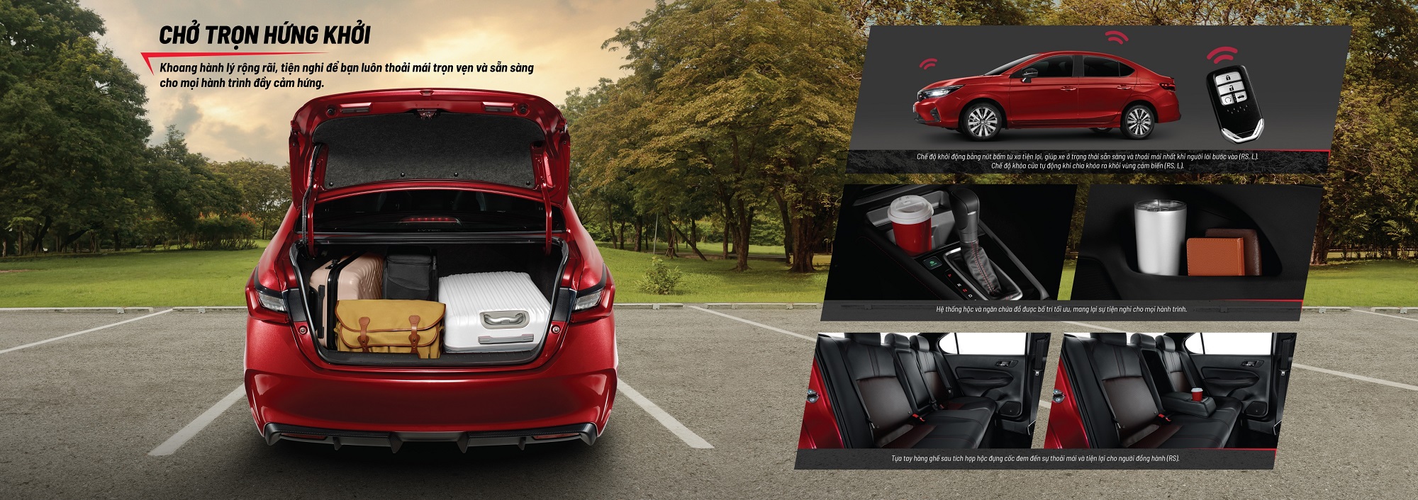 Nhằm mang lại sự tiện nghi tối đa cho khách hàng, Honda City mới tích hợp thêm nhiều tính năng tiện nghi hàng đầu phân khúc: Hệ thống âm thanh 8 loa cho âm thanh trung thực (RS, L); Lẫy chuyển số thể thao (RS, L); Chức năng khởi động xe từ xa (RS, L);...