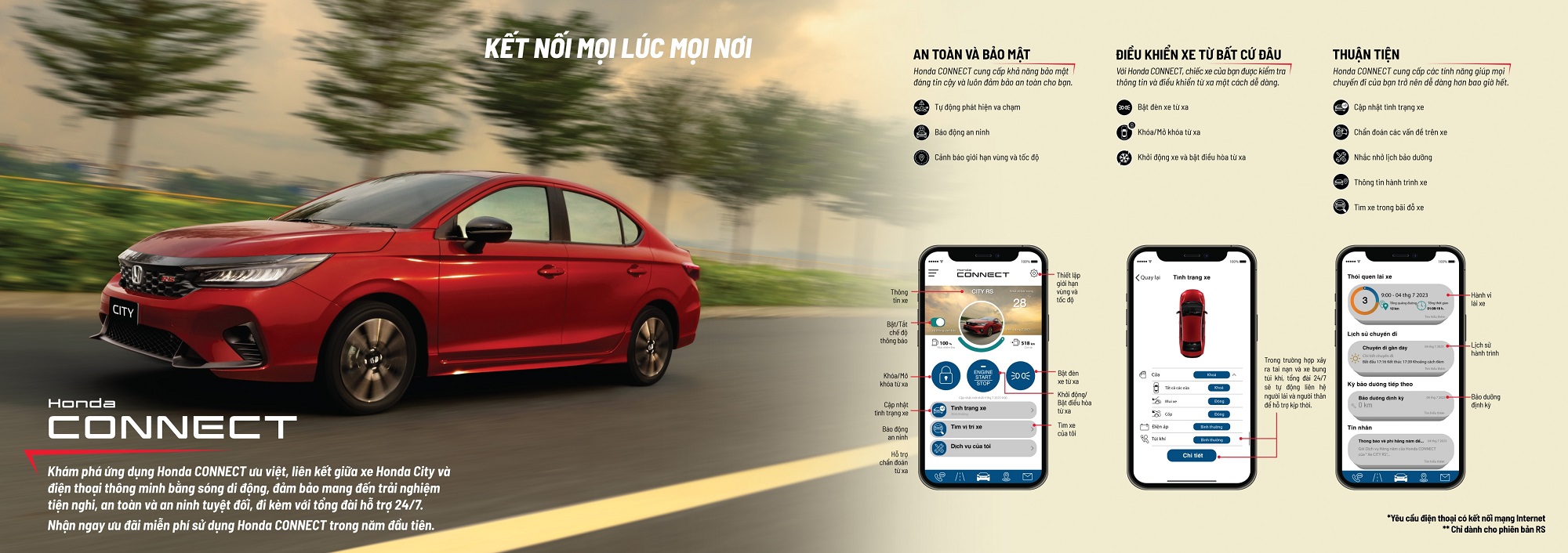 Đặc biệt, Honda City bản nâng cấp mới là mẫu xe thứ 4 tại Việt Nam (sau Civic, HR-V & Civic Type R) được trang bị hệ thống kết nối viễn thông ưu việt Honda CONNECT trên phiên bản RS. Hệ thống bao gồm 1 thiết bị được gắn trong xe, theo dõi toàn bộ các dữ liệu của xe, cho phép ghi nhận, lưu trữ và truyền tải thông tin thông qua sóng di động; giúp chủ sở hữu dễ dàng tiếp cận chiếc xe, cũng như mang lại cảm giác an tâm, niềm vui và tự hào khi sở hữu một chiếc ô tô Honda. Theo đó: