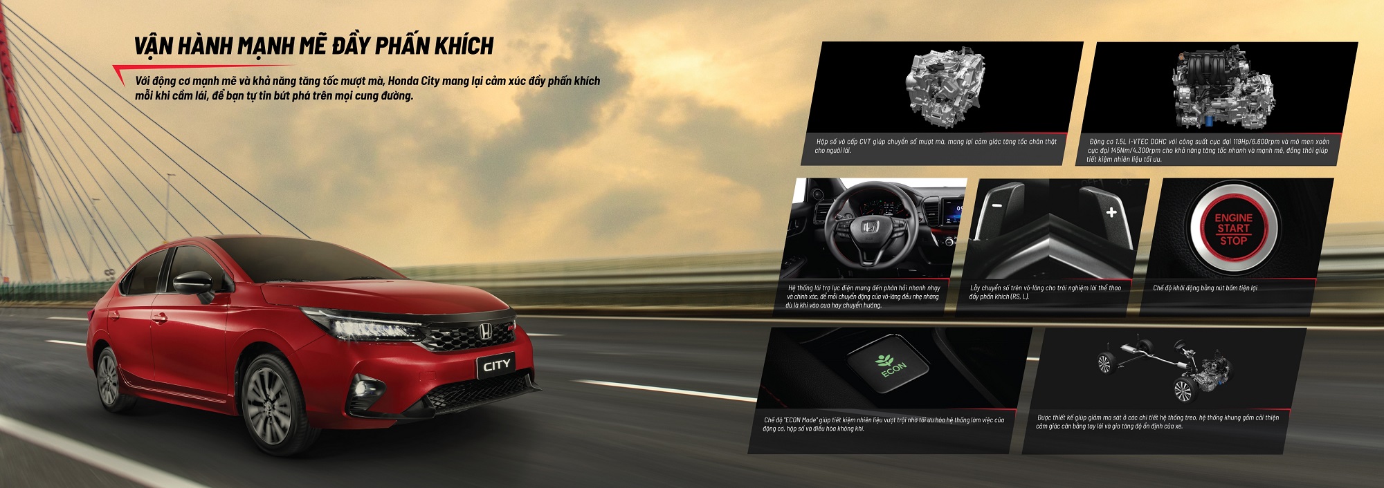 Bên cạnh những giá trị nổi bật về thiết kế, tiện nghi và công nghệ, khả năng vận hành chính là lợi thế cạnh tranh khác biệt vốn được coi là bản sắc thương hiệu của các sản phẩm ô tô Honda. Cả 3 phiên bản Honda City bản nâng cấp duy trì khối động cơ 1.5L DOHC i-VTEC, sản sinh công suất cực đại 119 Hp/6.600 rpm và mômen xoắn cực đại 145 Nm/ 4.300 rpm cùng hộp số tự động vô cấp (CVT), mang đến cho khách hàng một mẫu sedan với cảm giác lái phấn khích, an tâm trao trọn niềm tin khi trải nghiệm.