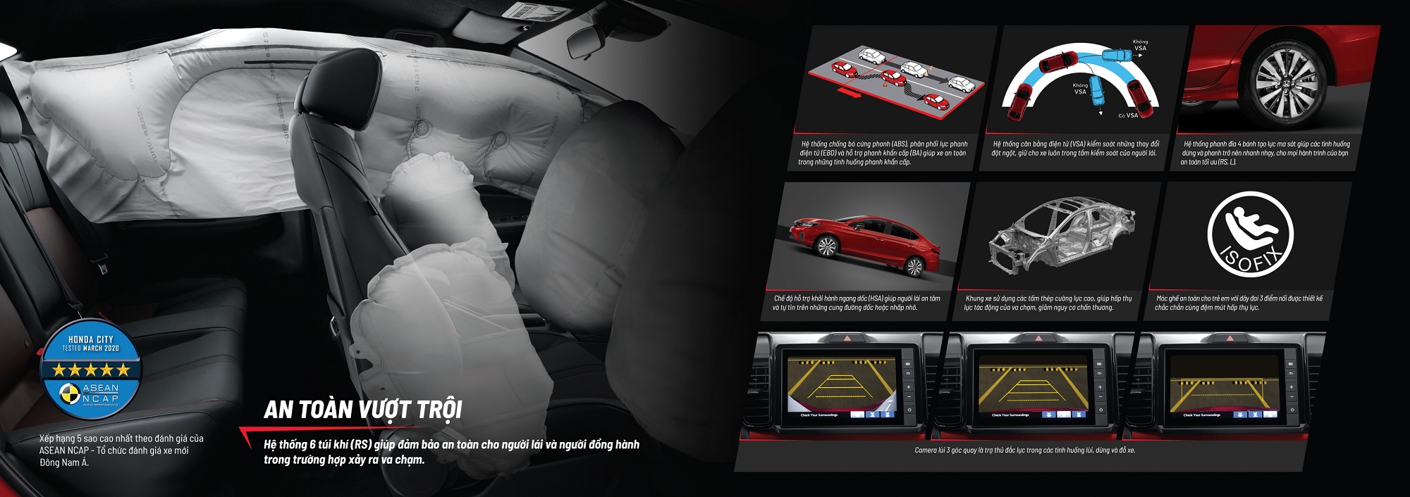 Đặc biệt, Honda City mới được trang bị phanh đĩa trên phiên bản RS và L, bên cạnh những tính năng an toàn chủ động và bị động tiên tiến vốn có như hệ thống 6 túi khí (RS), hệ thống chống bó cứng phanh (ABS), hệ thống phân phối lực phanh điện tử (EBD), hệ thống phanh khẩn cấp (BA), hệ thống cân bằng điện tử (VSA), hệ thống khởi hành ngang dốc (HSA), camera lùi (RS, L), ...