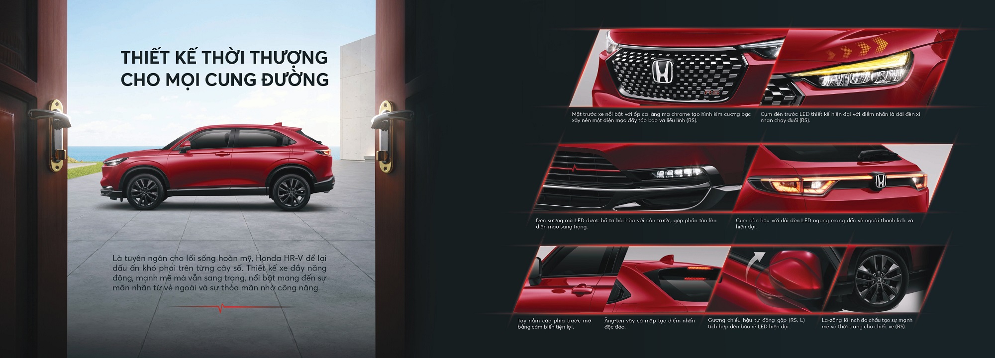 Honda HR-V hoàn toàn mới có kích thước dài, rộng, cao lần lượt là 4.385mm x 1.790mm x 1.590mm. Sự gia tăng chiều dài 51mm & chiều rộng 18mm làm cho chiếc xe trông lớn hơn so với phiên bản trước đó, cũng như càng làm tôn lên kiểu dáng đậm chất thể thao vốn có của dòng xe Honda. Thêm vào đó, tầm nhìn phía trước được mở rộng nhờ thiết kế bảng điều khiển trung tâm theo đường ngang và nắp ca-pô vát phẳng tạo một trải nghiệm lái thoải mái. Đặc biệt, đây là lần đầu tiên Honda Việt Nam giới thiệu đến khách hàng phiên bản thể thao RS (Road Sailing) của Honda HR-V. Bản RS tiếp tục nâng chất thể thao của Honda HR-V lên một tầm cao mới nhờ những điểm nhấn riêng biệt: lưới tản nhiệt và cản trước được sơn đen, logo RS được gắn ở đầu và đuôi xe, vành xe có đường kính lên đến 18 inch thể thao, khỏe khoắn. Ngoài thiết kế ấn tượng, Honda HR-V thế hệ thứ 2 còn mang đến những cải tiến đột phá với ”Vận hành thể thao vượt trội – Công nghệ tiên tiến – Tiện nghi, Thoải mái tối đa”.