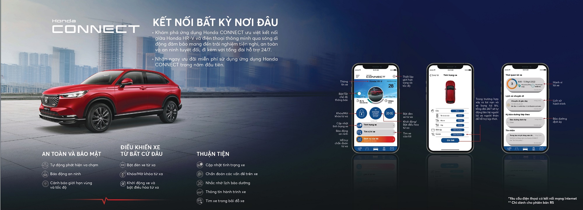 Honda HR-V hoàn toàn mới là mẫu xe Honda thứ 2 tại Việt Nam được trang bị hệ thống kết nối viễn thông ưu việt Honda CONNECT (bản RS). Hệ thống bao gồm 1 thiết bị được gắn trong xe, theo dõi toàn bộ các dữ liệu của xe, cho phép ghi nhận, lưu trữ và truyền dữ liệu ra bên ngoài thông qua sóng di động. Chỉ cần cài đặt ứng dụng Honda CONNECT trên điện thoại thông minh, chủ sở hữu có thể kết nối và quản lý Honda HR-V trong tầm tay, ở bất kỳ đâu và bất kỳ thời điểm nào. Với 3 nhóm chức năng chính của Honda CONNECT bao gồm: An toàn và bảo mật, Điều khiển xe từ bất cứ đâu và Thuận tiện giúp chủ sở hữu dễ dàng tiếp cận chiếc xe, cũng như mang lại cảm giác an tâm, thuận tiện, niềm vui và tự hào khi sở hữu một chiếc ô tô Honda. Theo đó: