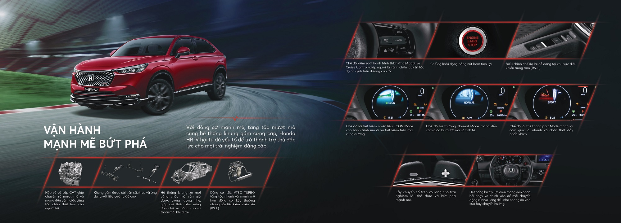 Lợi thế cạnh tranh khác biệt vốn được coi là bản sắc thương hiệu của các sản phẩm ô tô Honda chính là khả năng vận hành - thỏa mãn niềm vui cầm lái của khách hàng. Và HR-V thế hệ thứ 2 tiếp tục duy trì sứ mệnh đó. Với những cải tiến cho động cơ, Honda HR-V thế hệ thứ 2 tiếp tục đem lại cảm giác phấn khích hơn nữa khi cầm lái và khả năng tiết kiệm nhiên liệu vượt trội. Cả 2 phiên bản RS và L của Honda HR-V thế hệ mới đều được trang bị động cơ tăng áp 1.5L VTEC TURBO, sản sinh công suất cực đại lên đến 174 Hp ở vòng tua 6.000 vòng/phút và mô men xoắn cực đại lên đến 240 Nm tại dải vòng tua 1.700 - 4.500 vòng/phút. Khi tăng tốc từ 100km/h ở tốc độ cao để vượt, động cơ 1.5L VTEC TURBO giúp tạo cảm giác như động cơ hút khí tự nhiên mà không hề có độ trễ của Turbo và mang lại khả năng tăng tốc gấp 1,5 lần so với động cơ HR-V 1.8L DOHC thế hệ trước. Honda HR-V thế hệ thứ 2 sẽ mang đến một chuyến đi thoải mái và dễ chịu với cảm giác lái chắc tay, ổn định từ phút giây nổ máy nhờ: cải thiện độ cứng mặt bên xe và hệ thống lái để cân bằng tính ổn định phản ứng xử lý của xe, giảm thiểu ma sát trên hệ thống treo giúp chuyển động mượt mà và cải thiện độ ổn định của xe. Hệ thống giảm ồn, rung và giật (NVH) cũng được cải tiến để giảm tiếng ồn từ khoang động cơ và cả tiếng ồn từ mặt đường bằng cách thêm vật liệu cách âm quanh thân xe, tăng khả năng hấp thụ âm thanh.