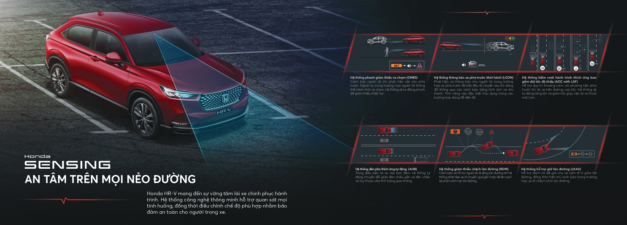 Cả 2 bản RS và L của Honda HR-V hoàn toàn mới đều được trang bị Hệ thống công nghệ hỗ trợ lái xe an toàn tiên tiến Honda SENSING gồm 6 tính năng ưu việt: CMBS, AHB, ACC with LSF, RDM, LKAS, LCDN. Bên cạnh các tính năng an toàn như hệ thống hỗ trợ đánh lái chủ động (AHA), hỗ trợ lực phanh khẩn cấp (BA), hỗ trợ khởi hành ngang dốc (HSA), HR-V hoàn toàn mới còn được trang bị thêm các trang bị an toàn vượt trội khác giúp bảo vệ hành khách trên xe cũng như người đi đường ở cấp độ cao nhất có thể.